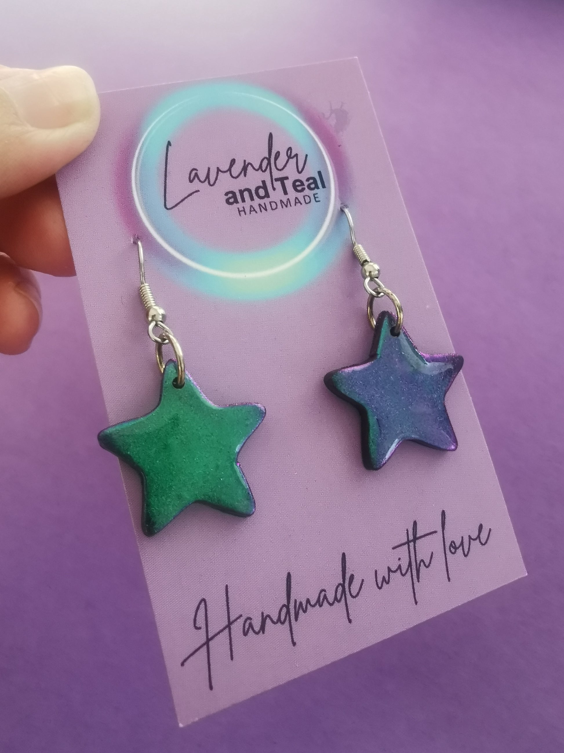 These are gorgeous colour shifting star earrings. They change in the most beautiful colours, from intense purple to blue, green, teal and subtle magenta.