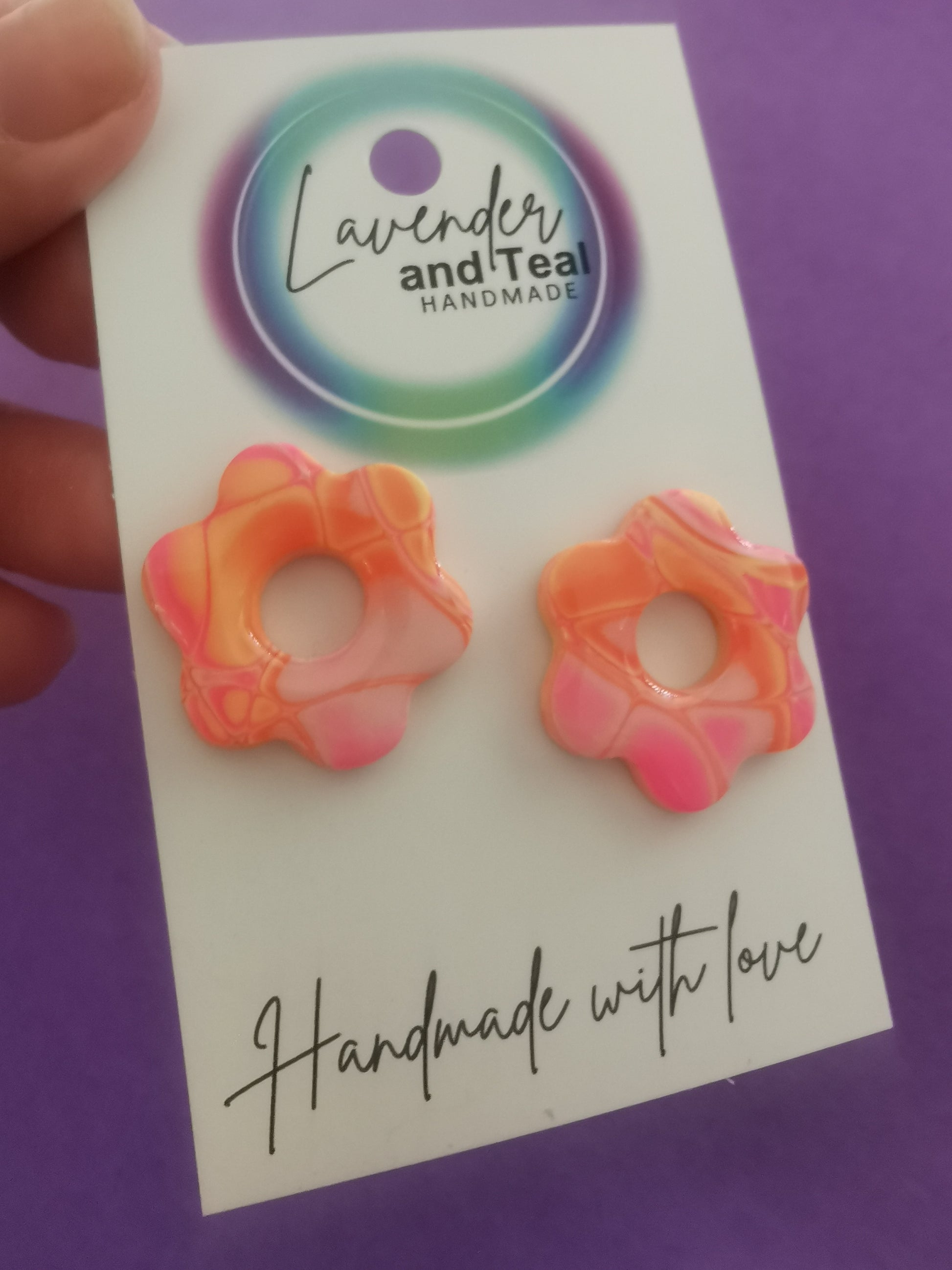 These bright earrings are made using a technique called Mokume Gane, which give a unique pattern, and no pair are the same.