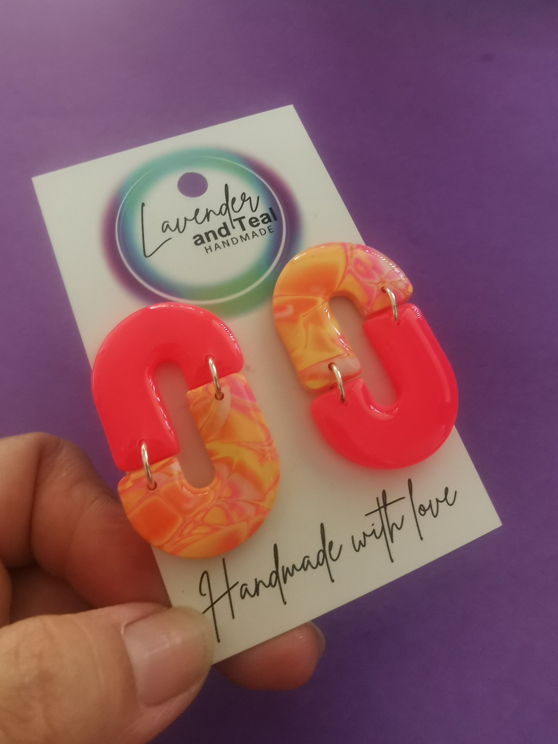 These bright earrings are made using a technique called Mokume Gane, which give a unique pattern, and no pair are the same.