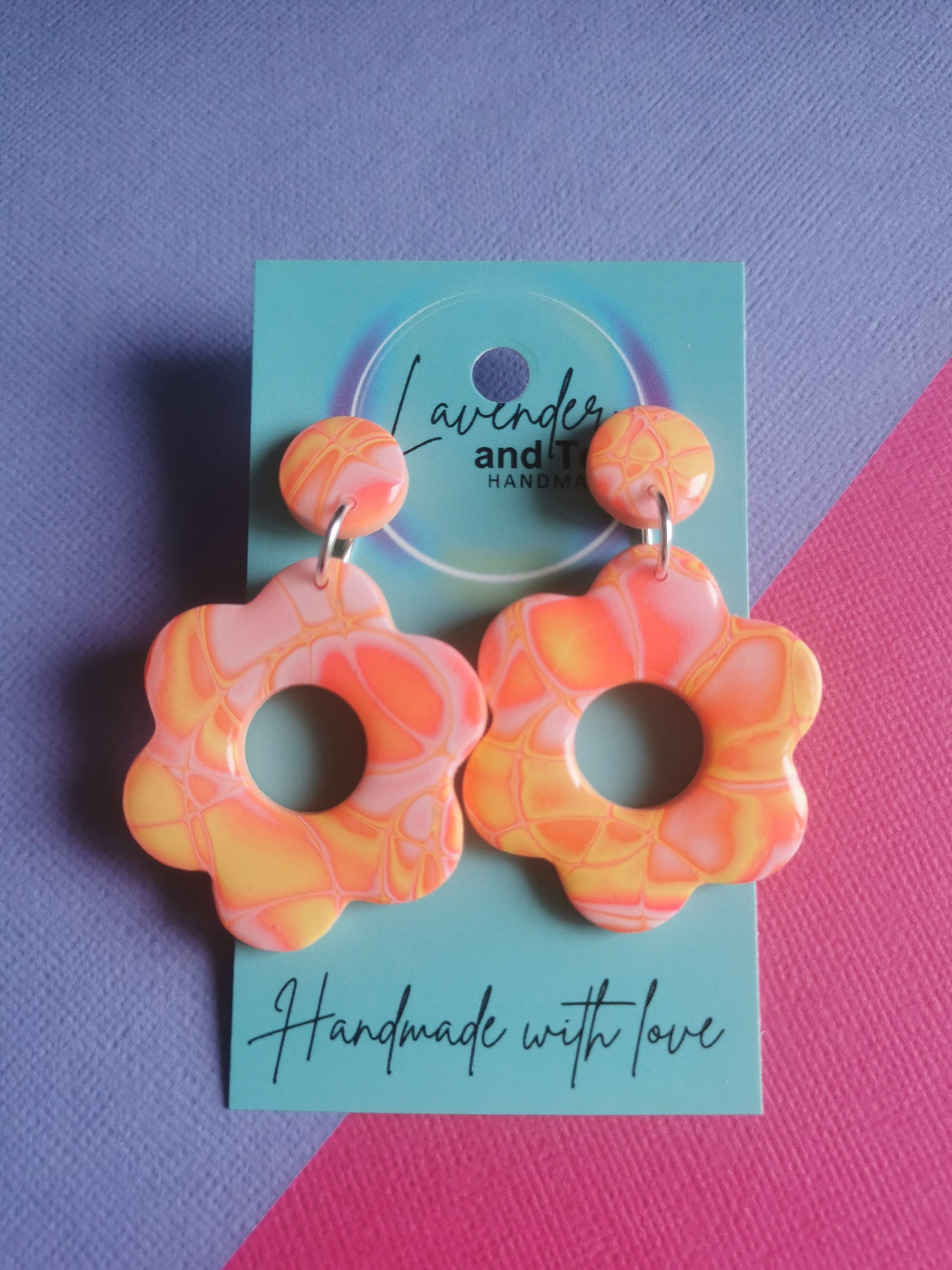 These bright earrings are made using a technique called Mokume Gane, which give a unique pattern, and no pair are the same.