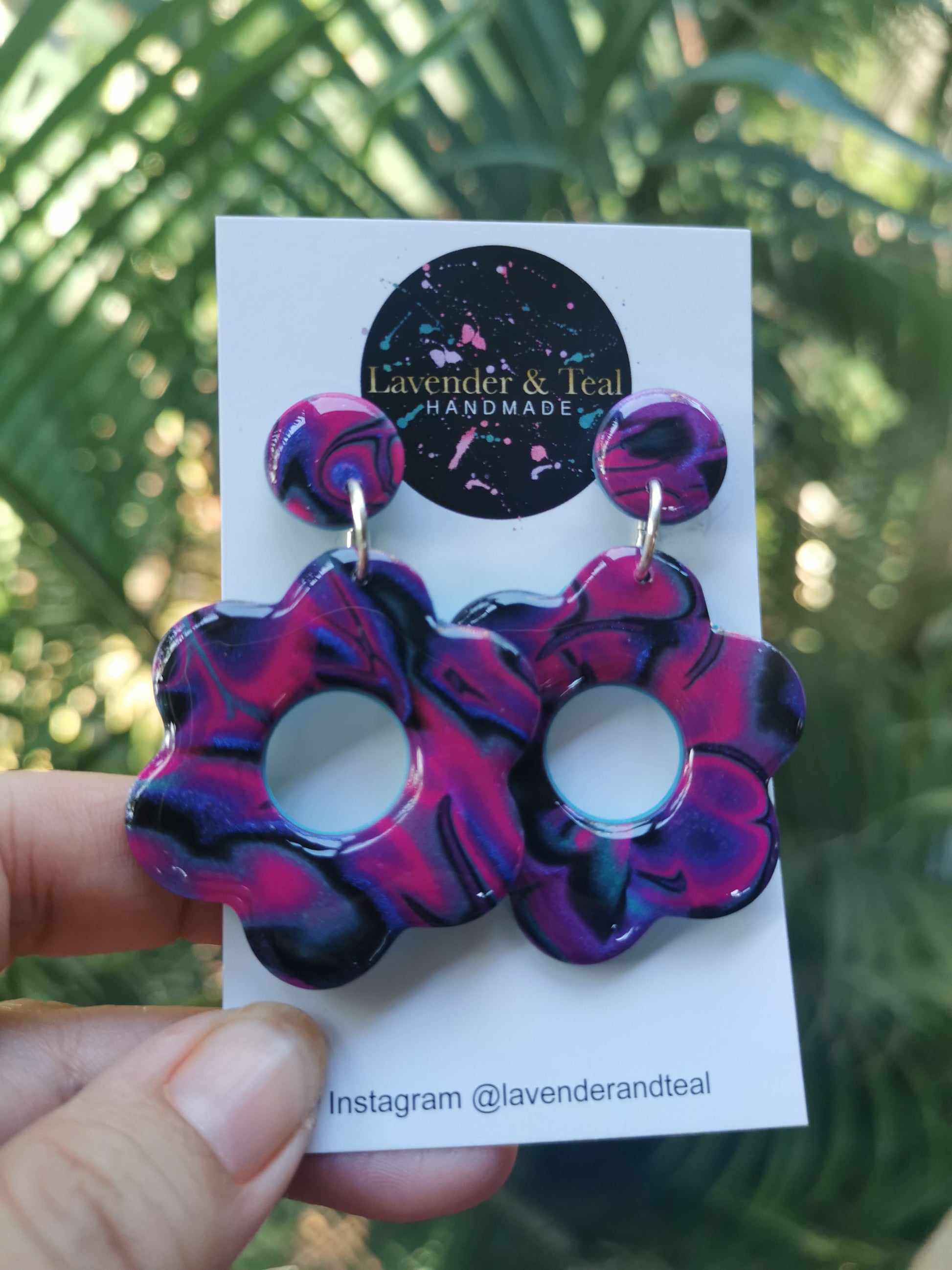 These bright earrings are made using a technique called Mokume Gane, which give a unique pattern, and no pair are the same.