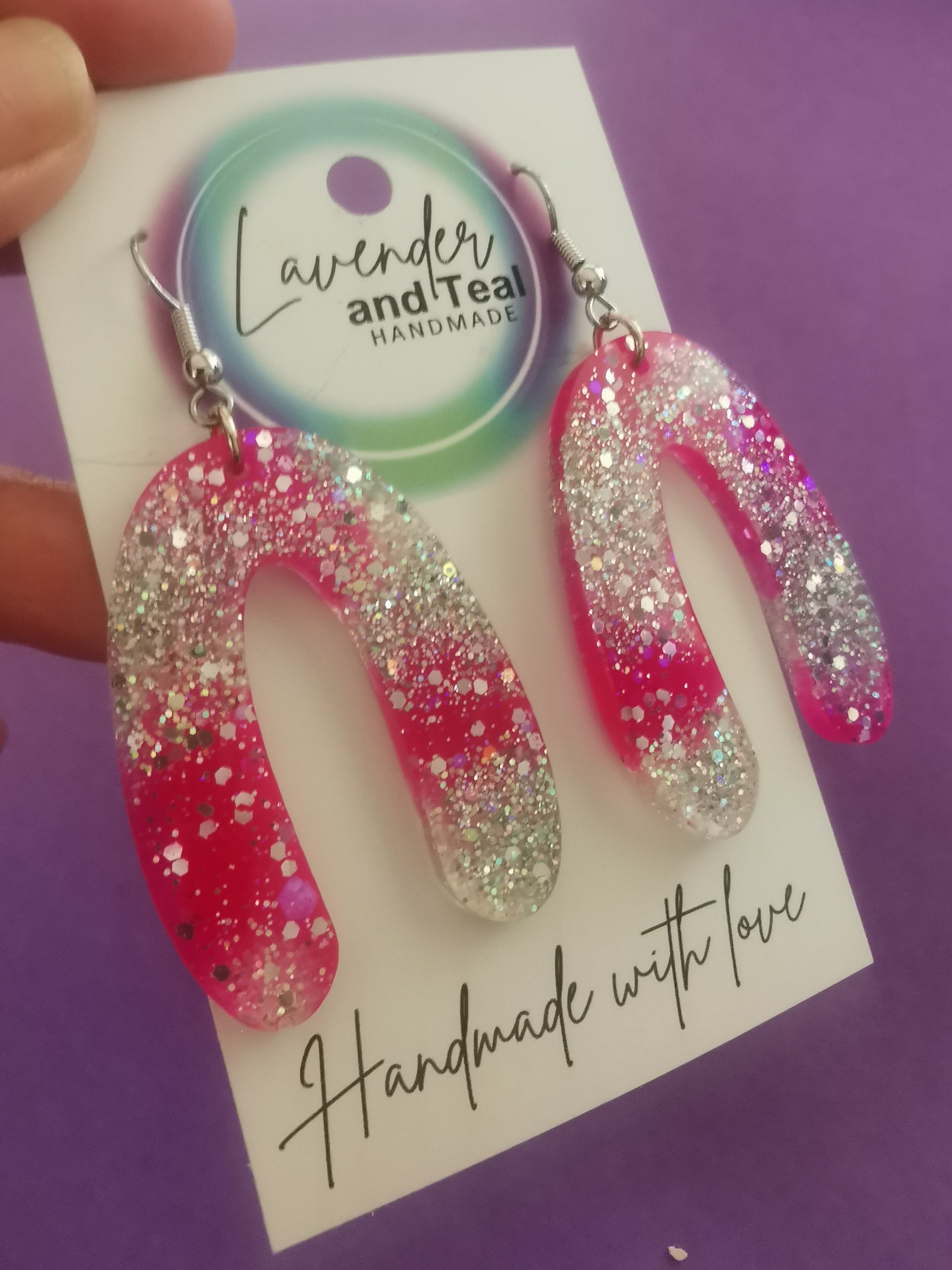 Pink & Silver Glittery Resin Arch Earrings
